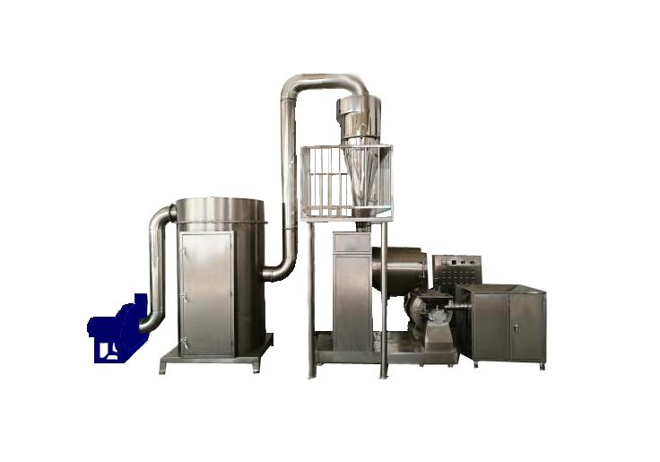 物料首先經(jīng)自動喂料,在負壓作用下,進入一級粗粉碎室,經(jīng)打板和牙板對物料的打擊、剪切、撞擊后到第二細粉碎室。帶有角度的打板在粗粉碎室內(nèi)高速旋轉,產(chǎn)生期間的快速相對運動,并向外推料,行成物料之間互相撞擊和物料與打板、牙板間的反復多次打擊,達到粉碎目的。粉碎后物料在負壓作用下輸送至分離器進入篩粉機,合格藥粉在篩粉機下口收集,不合格藥粉自動回到粉碎室二次粉碎。含塵的氣體進入除塵箱體,經(jīng)過濾袋進行過濾,粉塵被阻留在外表面,經(jīng)脈沖除塵裝置振打后落入料斗排出,凈化后的空氣由風機排出箱體外。